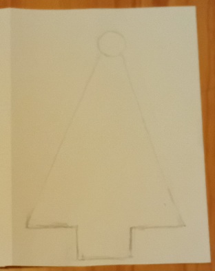 1. lépés: Vázoljunk fel a lap közepére egy karácsonyfát! (Ha A5-ös a papír, érdemes félbehajtani, kisebb lapon szebb a végeredmény.)