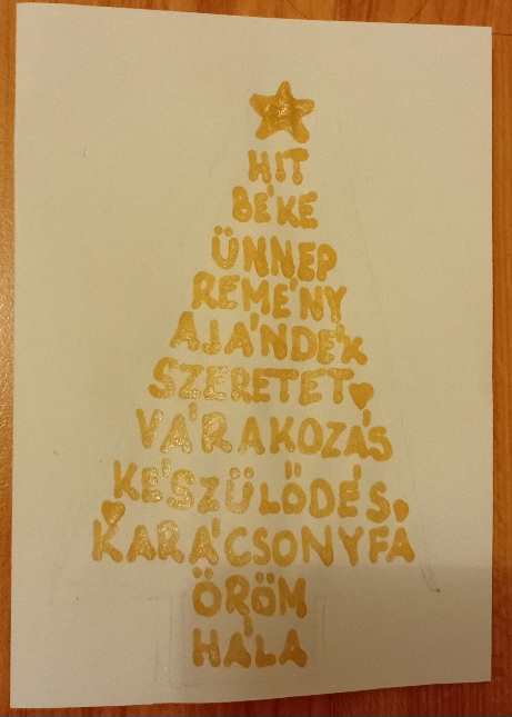 2. lépés: A karácsonyfába fentről lefelé írjuk be arany vagy ezüst filccel az alábbi szavakat: hit, béke, ünnep, remény, ajándék, szeretet, várakozás, készülődés, karácsonyfa; a törzsébe pedig az öröm és hála szavakat. Rajzoljuk meg a fa tetejére a csillagot, és radírozzuk ki a grafitnyomokat.