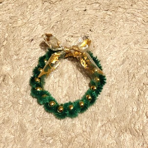 Alapanyagok 1 db kis koszorúhoz: 2 db zseníliadrót, 1 db körülbelül 15 cm hosszúságú gyönygös girland, 1 db kb. 15 cm-es és 1 db kb. 25 cm-es szalag