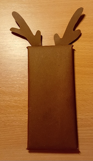 2. lépés: Zseníliadrótból hajlítsuk meg az agancsokat, vagy vágjuk ki őket papírból és ragasszuk fel őket a csoki hátuljára! (A tábla két oldalára is ragaszthatjuk őket, de így kevésbé lesz stabil, ha zseníliadrótot használunk)