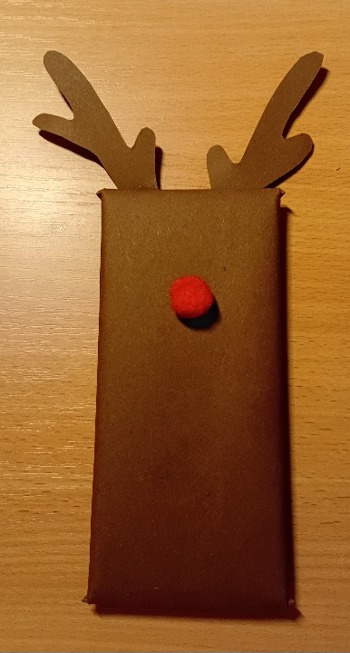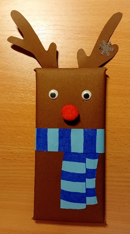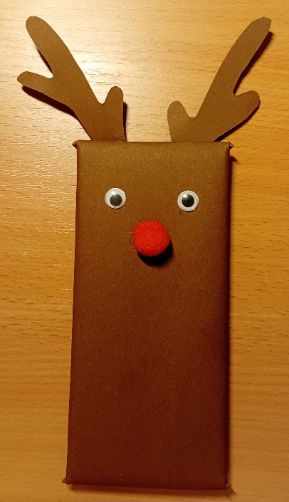 Alapanyagok: csokoládé (lehetőleg táblás, de másból is meg lehet oldani), fekete filctoll (jó, ha van alkoholos filcünk), nagyobb méretű piros gyöngy vagy pompom, barna csomagolópapír vagy vékony papírlap, barna zseníliadrót vagy vastagabb barna papír (olló, grafitceruza)