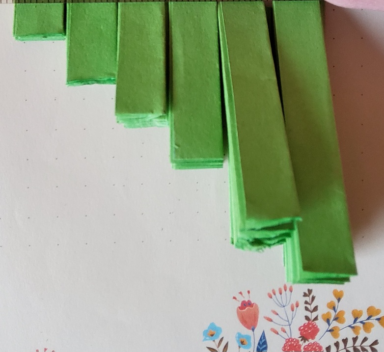 7. lépés: Vágjuk fel a zöld papírt úgy, hogy minden darab az előzőnél kicsivel rövidebb legyen! Az első hossza körülbelül legyen az egész papír hosszának harmada, és hat darabra lesz szükségünk. (Előfordulhat, hogy több darab keletkezik a darabolás során, ez ezetben a feleslegeseket tegyük félre, nem lesz rájuk szükségünk.)