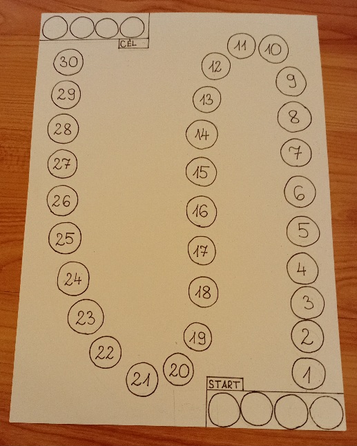 1. lépés: A vastag fehér papírra rajzoljuk fel a START, a CÉL és a köztes mezőket! Minimum 30, maximum 60 köztes mező legyen! Ha biztosak vagyunk a vonalakban, ki is kontúrozhatjuk.