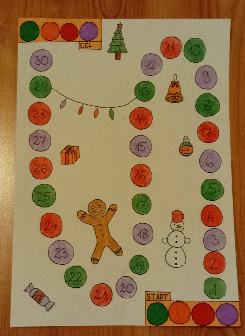 2. lépés: Találjuk ki, hányféle kérdéskártyát szeretnénk, és ennek megfelelően annyi és olyan színekkel színezzük ki a mezőket, ahányféle, és amilyen színű kérdéskártyákat szeretnénk. Színezzük ki a bábuk helyét jelölő mezőket is! A játéktáblát dekoráljuk további rajzokkal, pl. karácsonyfával, mézeskalács figurával, hóemberrel.