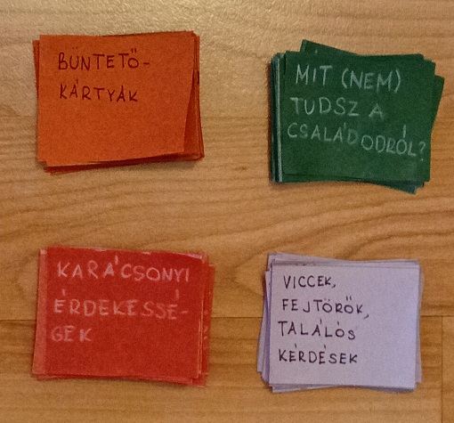 3. lépés: Készítsük el a kérdéskártyákat! Egy kártya 4x5 cm-es legyen! Az egyes témák lehetnek például karácsonyi érdekességek, mit (nem) tudsz a családtagjaidról, viccek, fejtörők, találós kérdések, de ti is kitalálhattok szórakoztató és érdekes témákat. A kártya egyik felén legyen a kérdés, másik felén a válasz, de lehetnek olyan kártyák is, amiknek akár több jó válasza is van. Készítsünk büntetőkártyákat is, pl.: 10 fekvőtámasz, lépj vissza hármat, de akár nagyobb feladatokat is írhatunk, pl. vigyél a szomszédnak bejglit.