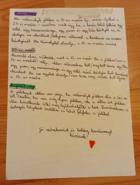 4. lépés: A vékonyabb fehér papírra írjuk fel pontosan a játék szabályait. Végezzük el az utolsó simításokat mindenhol és már kezdődhet is a játék a saját készítésű társasjátékotokkal! Bábunak használhattok pompomokat/radírt/pénzérmét/kupakot. A dobókockát pedig vegyétek ki egy másik játékból, vagy készítsetek sajátot a Karácsonyi angyalkás doboz című cikkünk alapján, amit ide kattintva értek el. Csupán annyit kell tennetek, hogy kisebb kockát készítetek, és a tetejének minden oldalára is készítetek füleket.