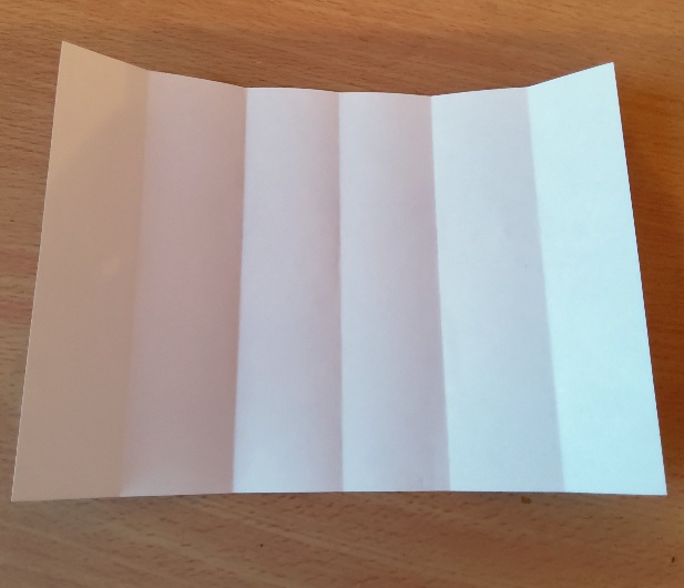 1. lépés: Osszuk fel a lapot a kívánt darabszámú részre! Ez sok esetben könnyen megoldható csak hajtogatással (pl. 2, 4, 8 darab) azonban ha szükséges, nyugodtan használhatunk vonalzót is. Ha A5-ös lapokkal dolgozunk, nagy darabszám esetén több lapra is szükségünk lehet. Nyugodtan variálhatunk a könyvjelzők méretével és a lap állítva, illetve fektetve tartásával is. Mi például 6 főre készítjük, így a részekre osztást megoldottuk a lap félbehajtásával, majd a két rész harmadolásával.