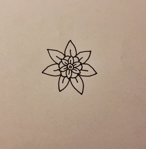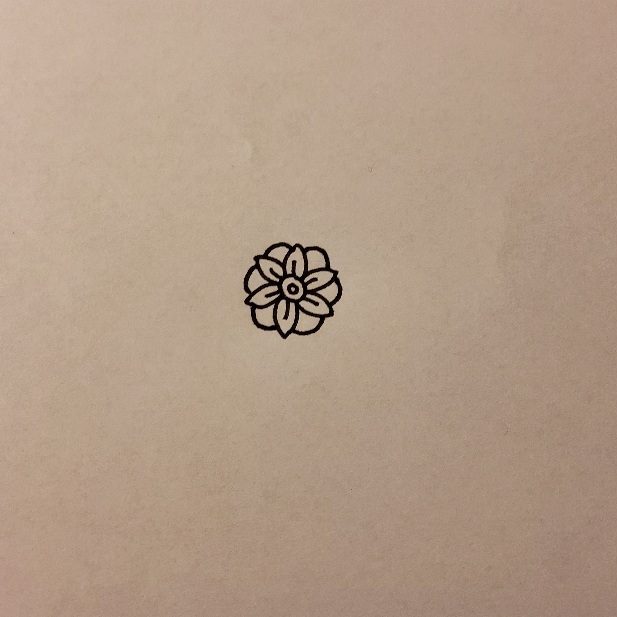 1. lépés: Rajzoljuk meg a mandala központjában álló elemet! Ez legtöbbször egy virágra hasonlító forma. Ügyeljünk rá, hogy körülbelül középre rajzoljuk, ne túl nagyba, hogy a lapon minden irányba elegendő hely legyen a mandalánk nagyobbítására! Tipp: Ha biztosak vagyunk a dolgunkban, rajzolhatjuk a mandalát egyből tűfilccel, hiszen így az igazi az élmény, nem kell semmilyen grafitvonalat követnünk, szabadon alkothatunk. Azonban ha bizonytalanabbnak érezzük magunkat vagy most csinálunk először ilyesmit, nyugodtan felvázolhatjuk először ceruzával.