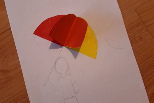 7. lépés: Ragasszuk fel ezt a formát a rajzon az esernyő helyére! Ha nem egyezik a mérete a rajzzal, a rajzon az esernyő körvonalát radírozzuk ki!