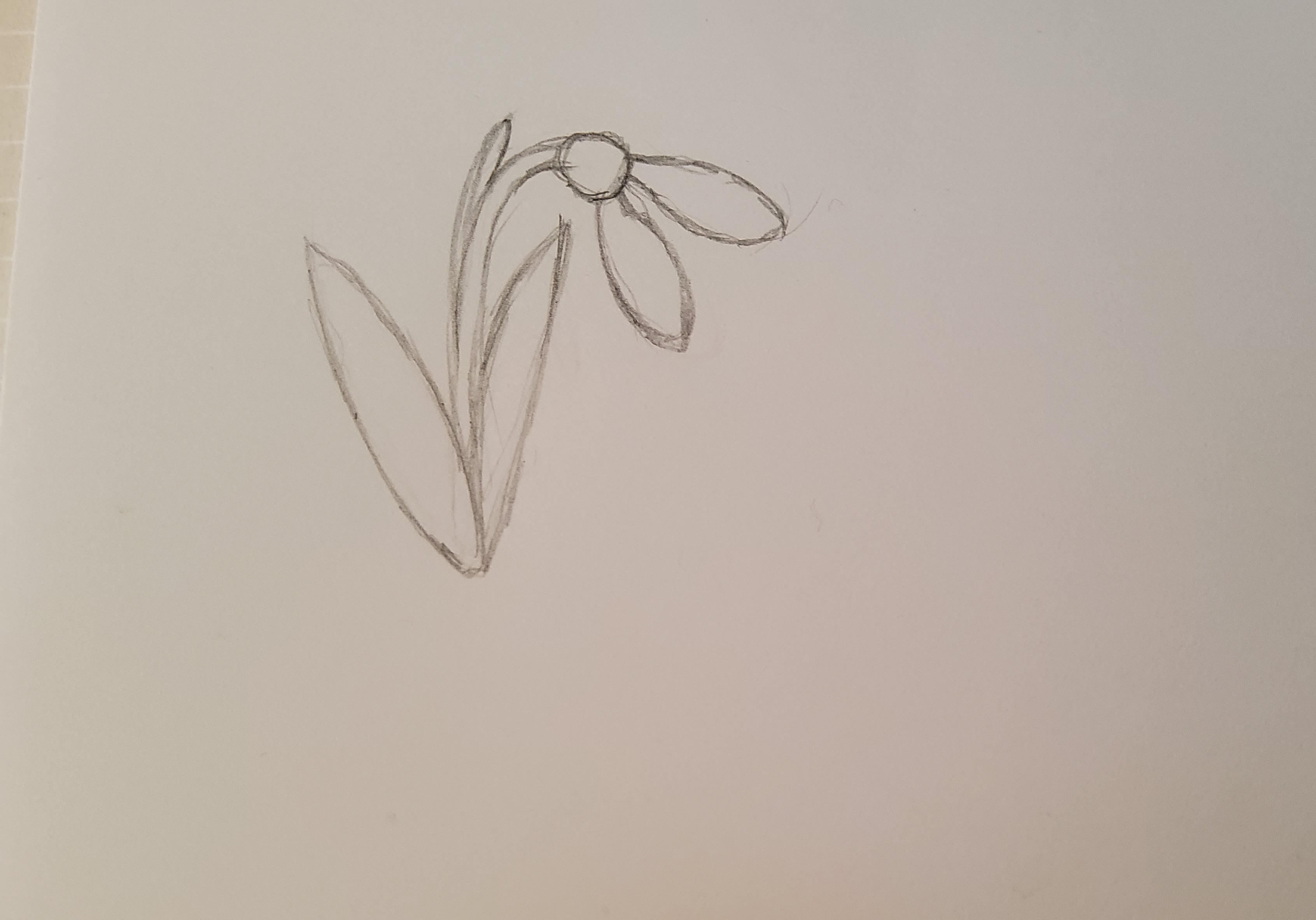 2. lépés: Vázoljuk fel a leveleket! Kettő levél kerül lentre, egy pedig felülre. Figyeljünk arra, hogy vékonyak legyenek! Mi már megrajzoltuk a szirmokat tartó részt is.