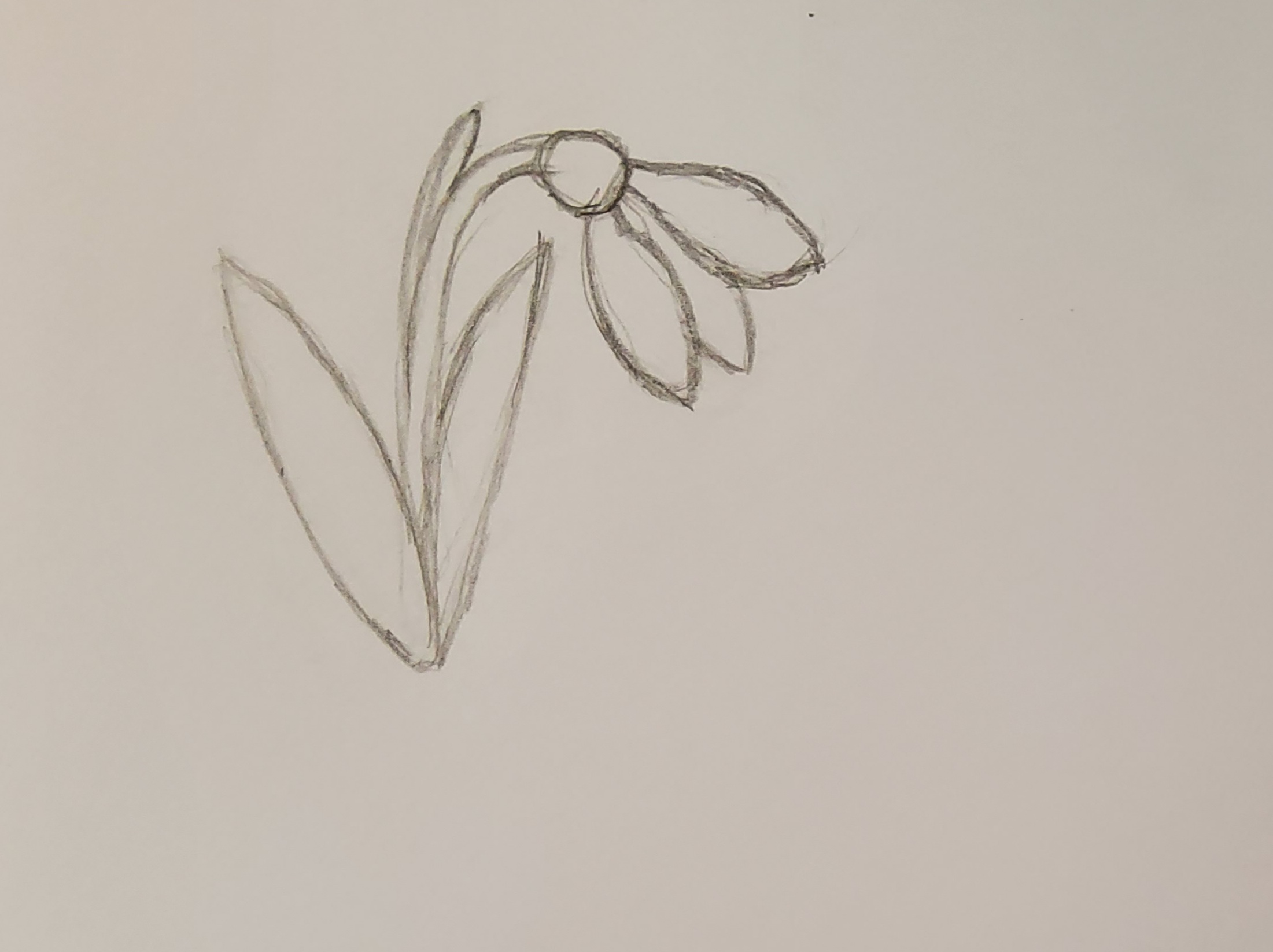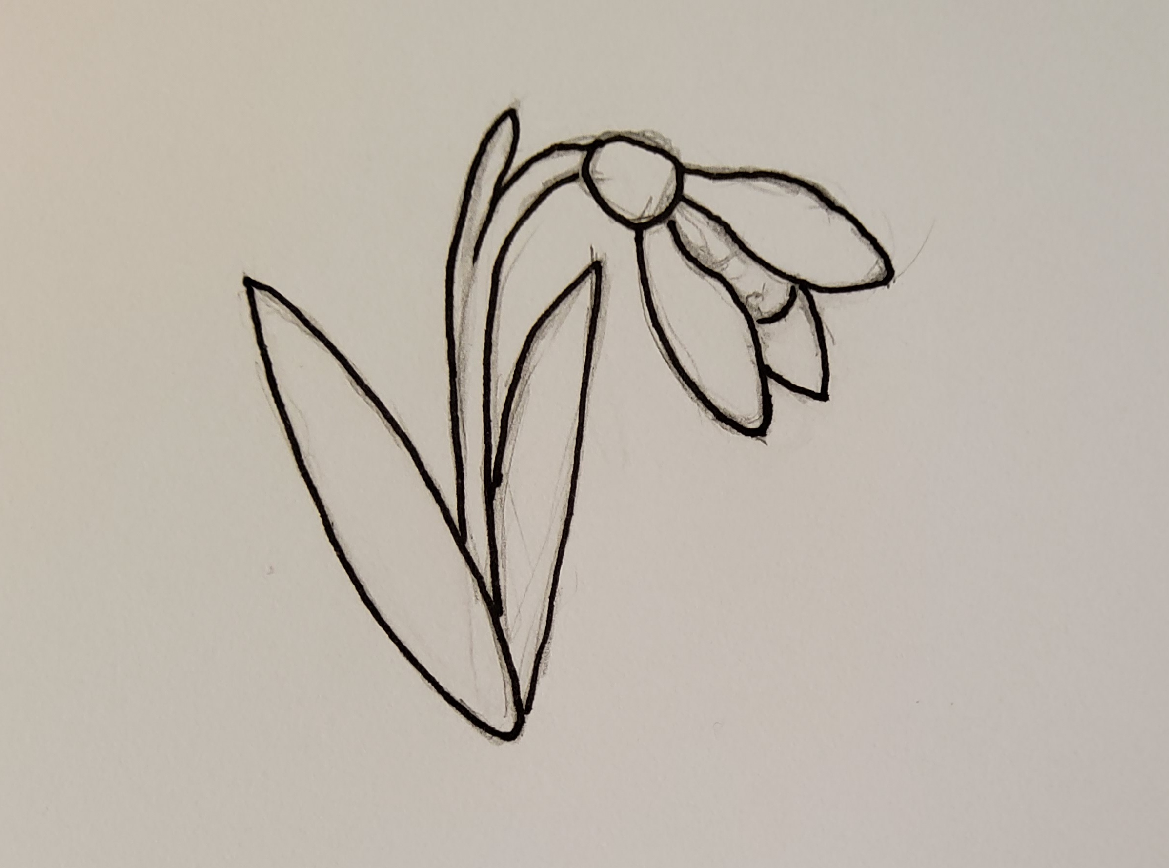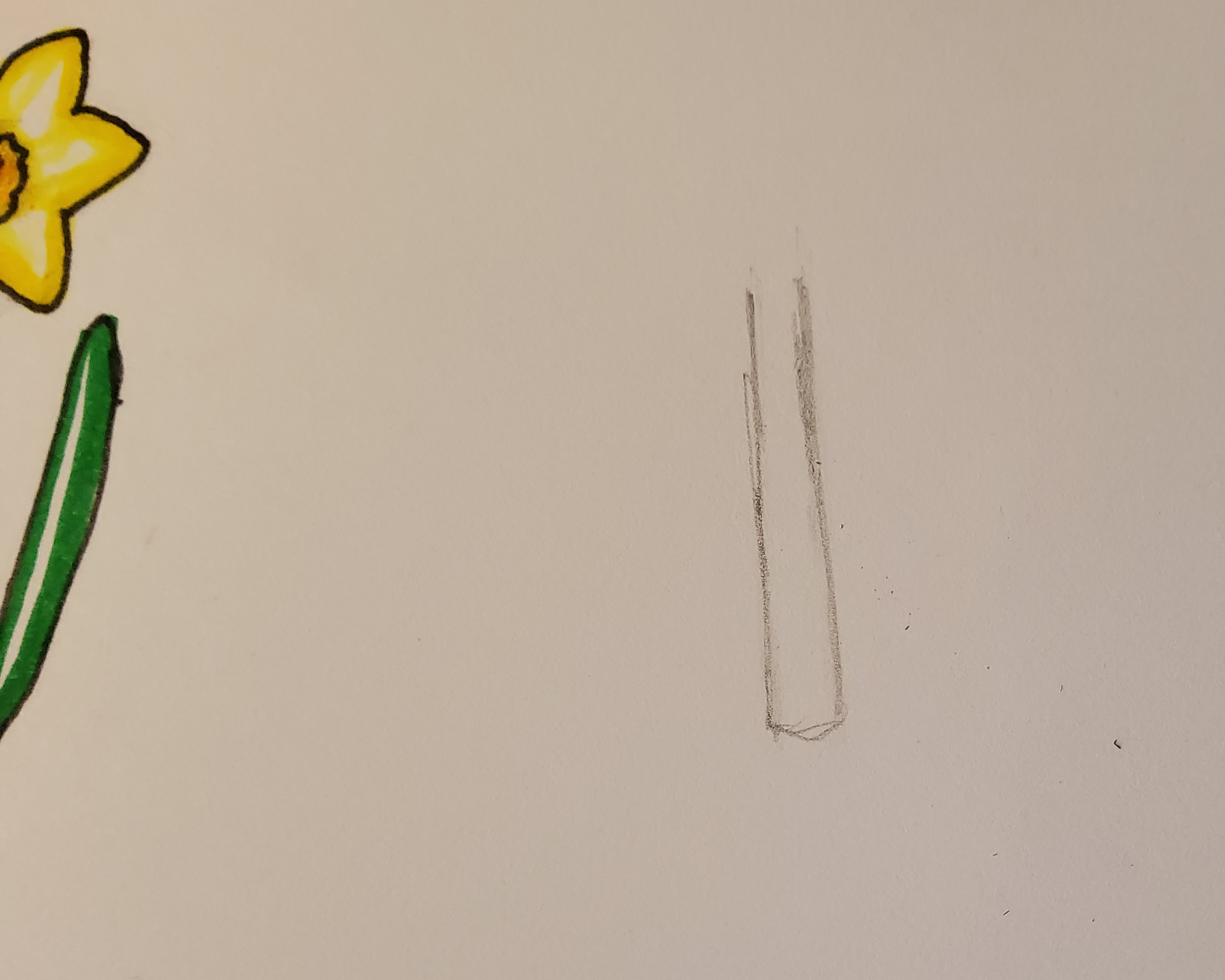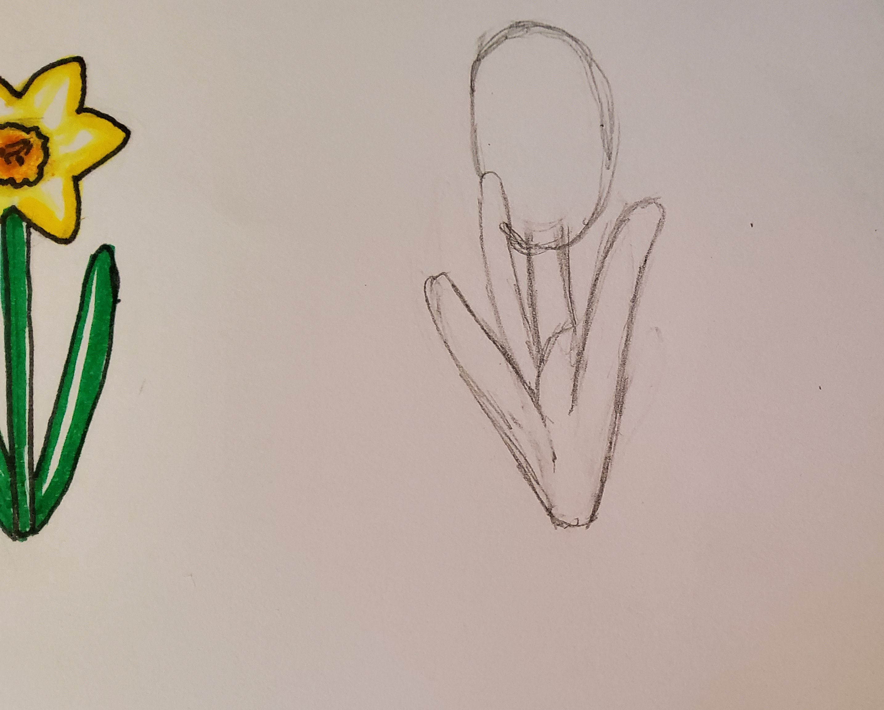3. lépés: A szirmok megrajzolása. Először a két szélső szirmot rajzoljuk meg! A szirmok vége enyhén lekerekített, és a szárhoz közeledve kicsit elvékonyodik.