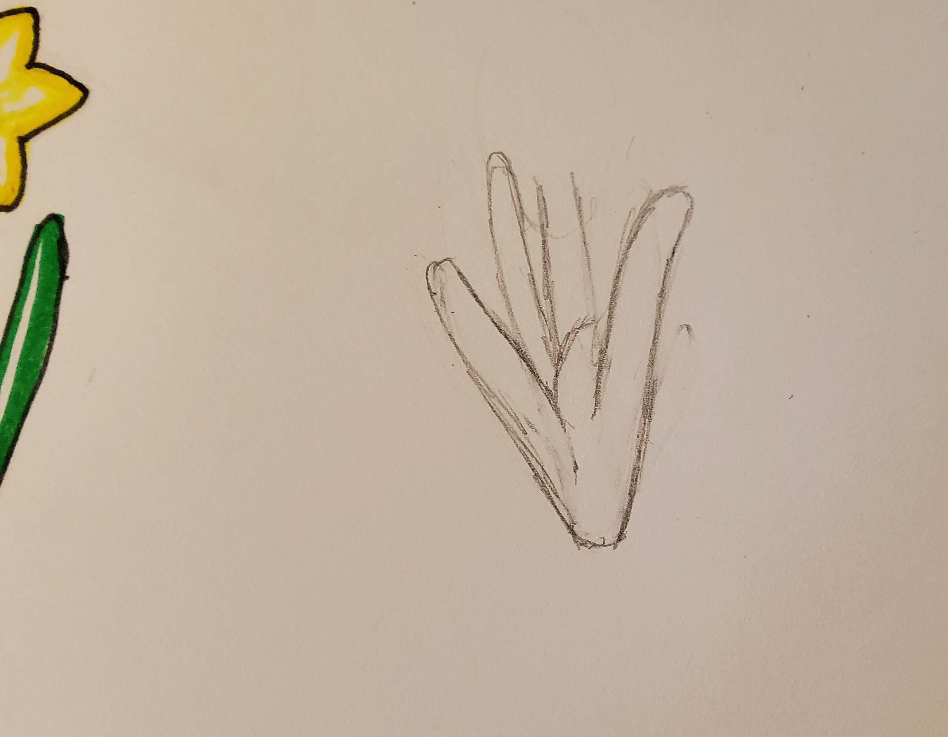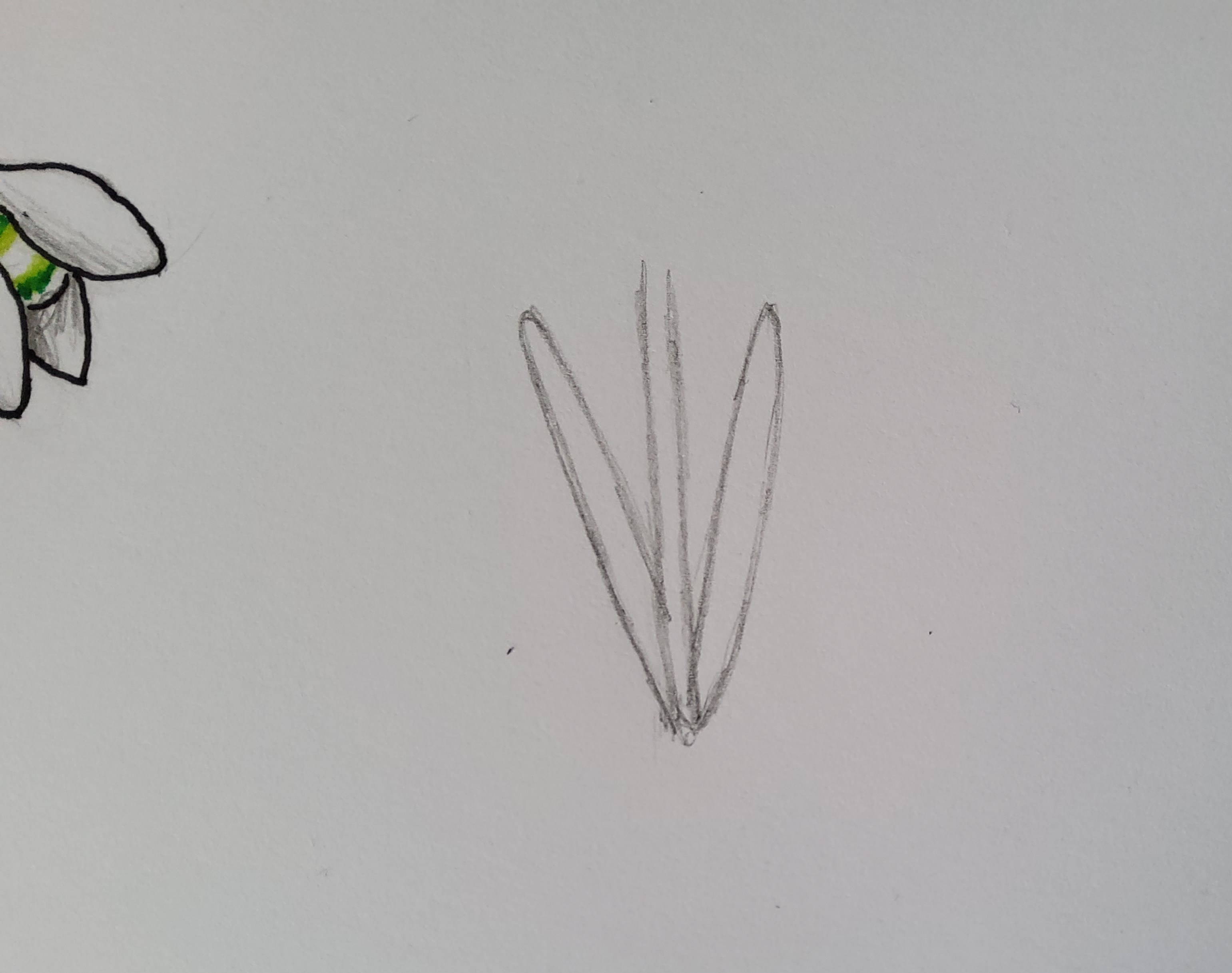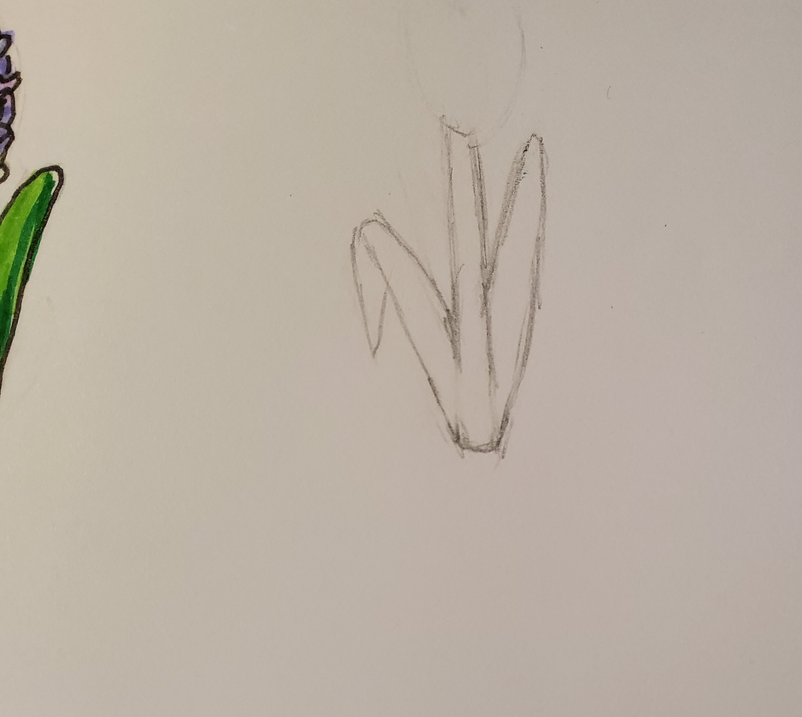 2. lépés: A jácinthoz hasonló módszerrel rajzoljuk meg a leveleket! Itt kicsit kevésbé legyenek kuszák, és elég csak kettőt rajzolni.