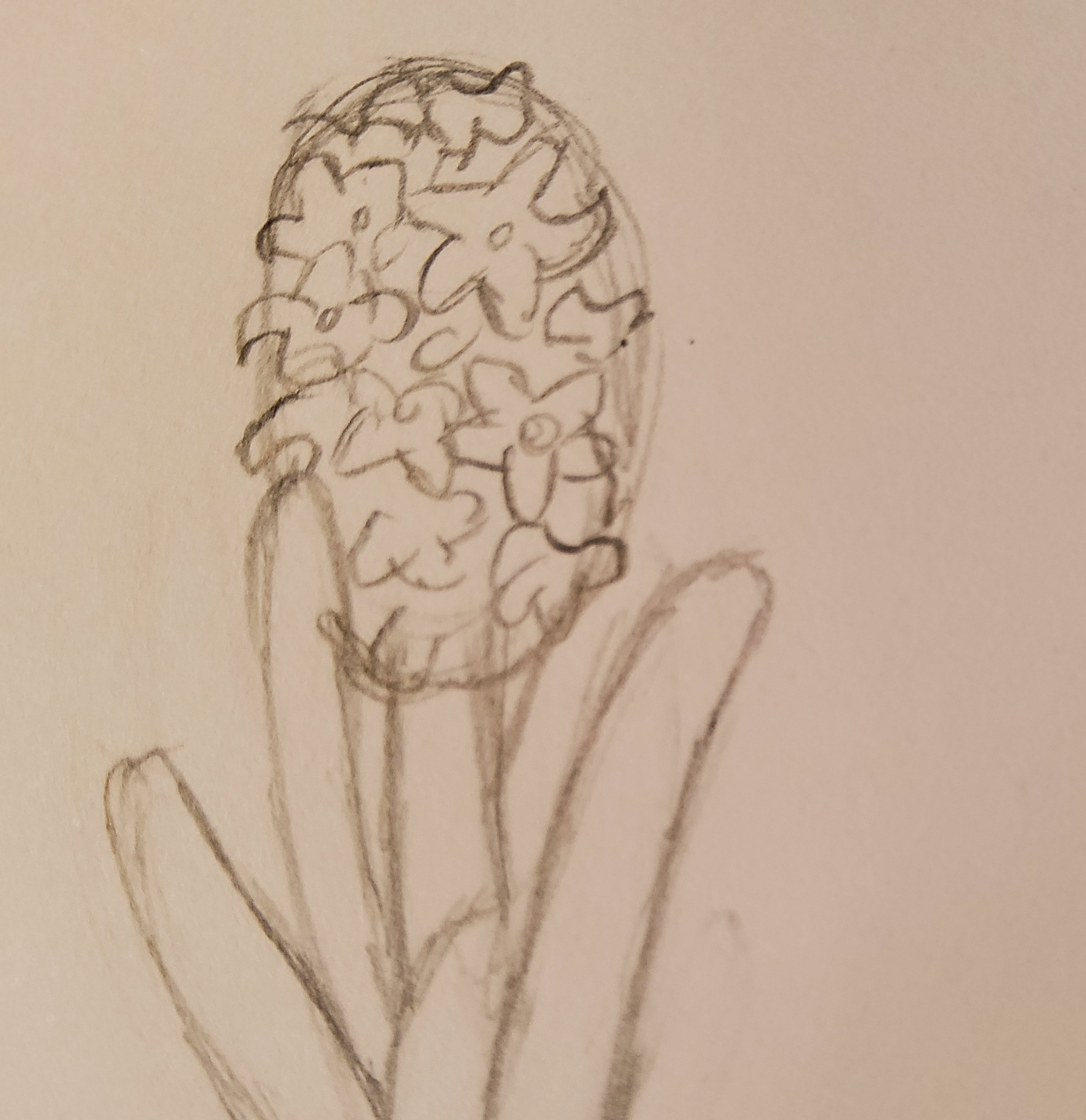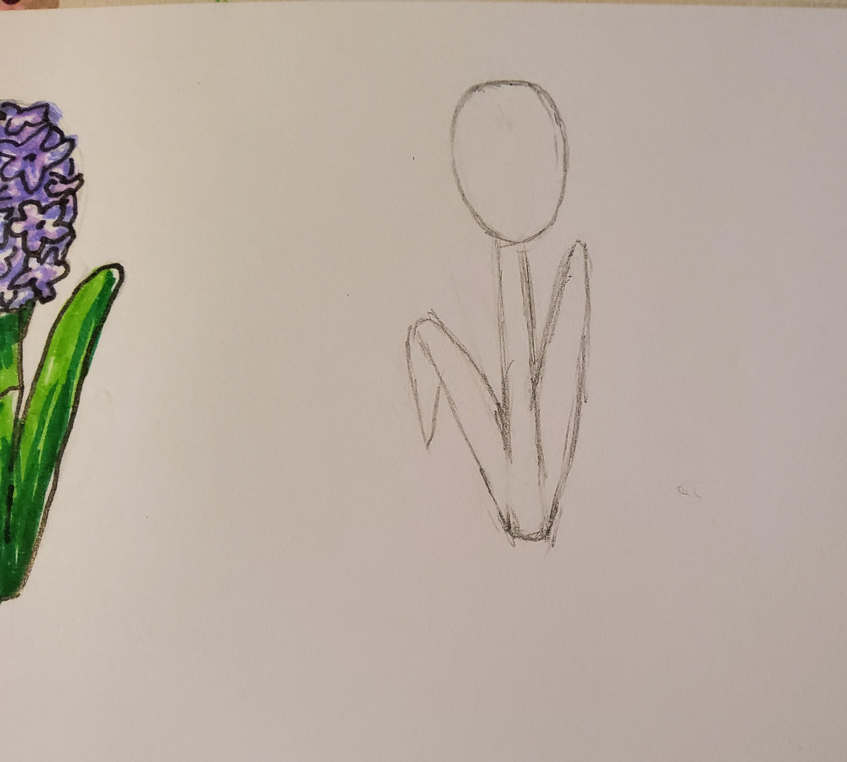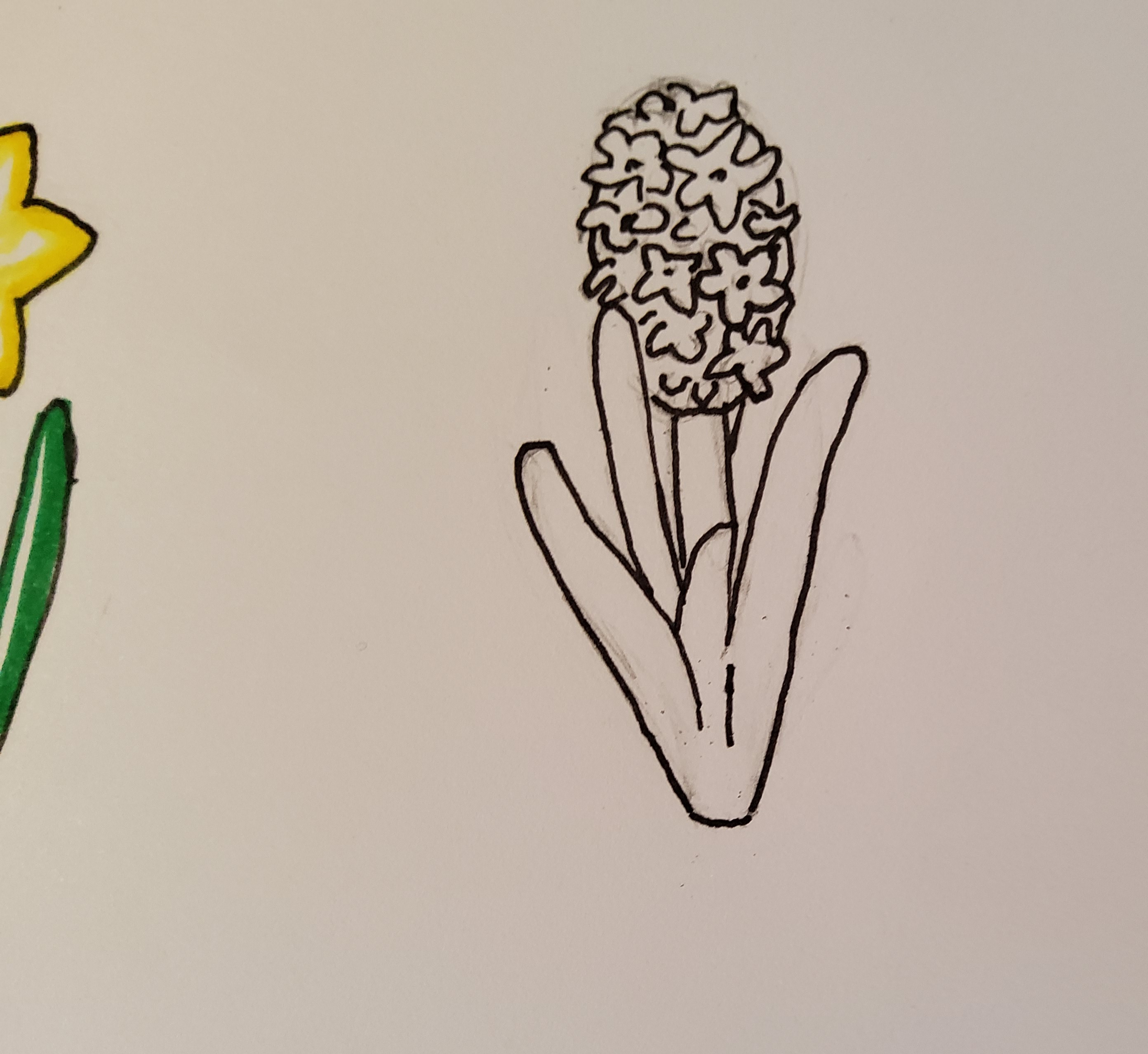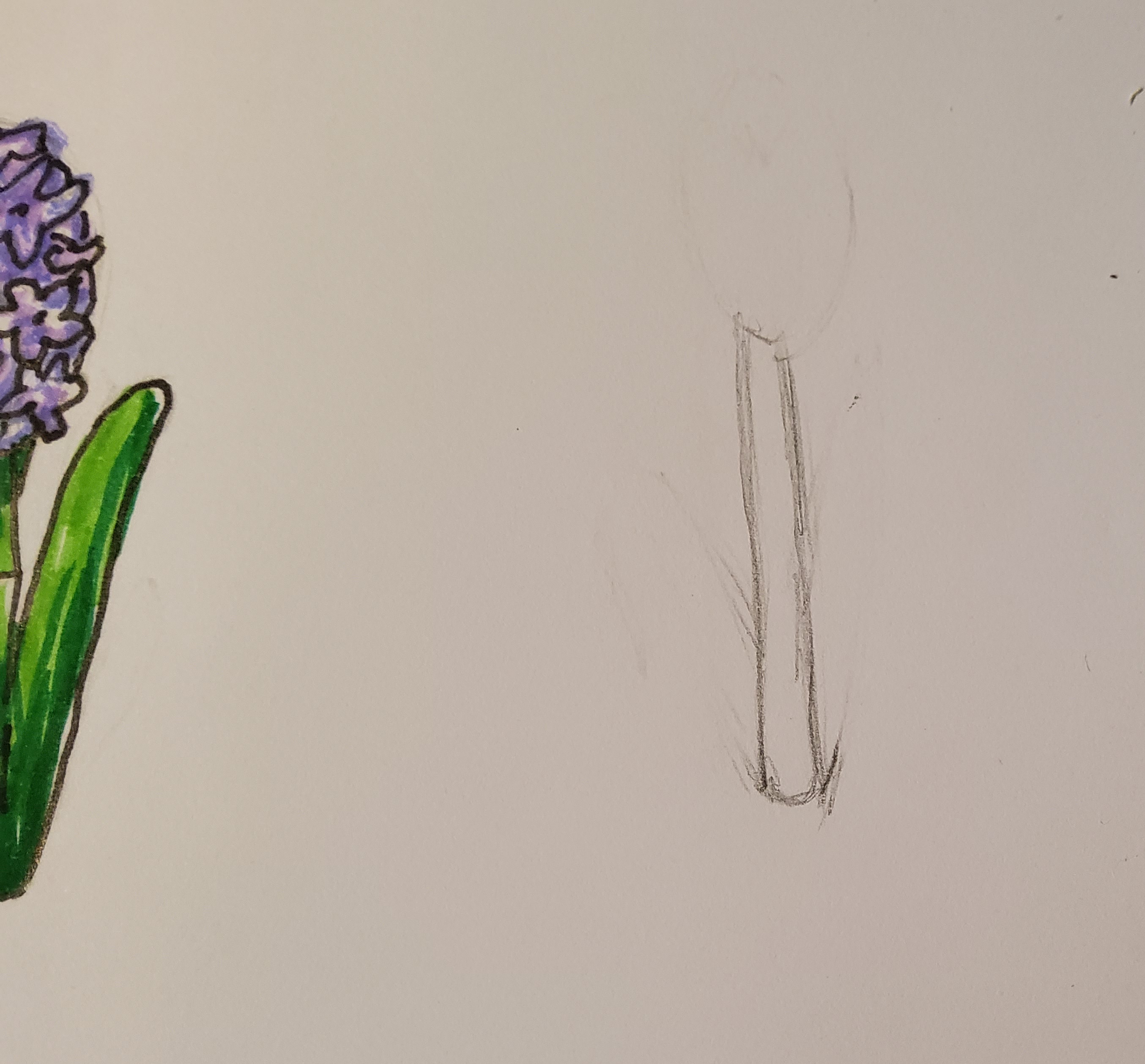 2. lépés: A jácinthoz hasonló módszerrel rajzoljuk meg a leveleket! Itt kicsit kevésbé legyenek kuszák, és elég csak kettőt rajzolni.